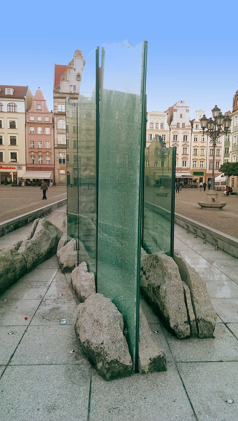 Odkształcenie szkła potrójnie laminowanego, hartowanego – fontanna na rynku wrocławskim