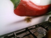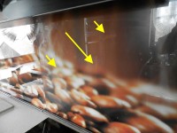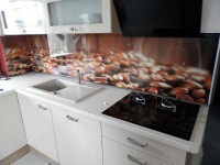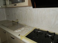 Firma Majster Szklarz przyjęła zamówienie zdesperowanego Klienta na wymianę panelu szklanego w kuchni. Panel szklany wykonywany był i montowany przez pobliskiego szklarza (znamy jego namiary). Jakość druku pozostawiała wiele do życzenia – niewyraźny jakby za mgłą. Pomijając fakt niezgranej grafiki, niepotrzebnego podziału szkła czy zastosowania aluminiowych profili maskujących krzywo docięte tafle, panel po kilku miesiącach użytkowania zaczął bąblować.