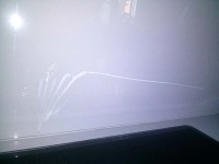 Na całym panelu widoczne są pionowe pasy, które biegną przez całą wysokość i na całej szerokości szkła w regularnych odstępach co 0.5 cm. Dla lepszego zobrazowania fragmentarycznie zaznaczyłam wadę.