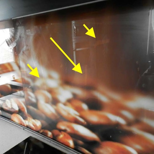 Powstałe wady są wynikiem słabej jakości druku, złego „zaprimerowania” szkła i wątpliwej jakości materiałów drukarskich. Wbrew zapewnieniom producenta druk ten nie nadaje się na szkło montowane w łazienkach i kuchni gdzie występuje zwiększona wilgotnośc i temperatura otoczenia.